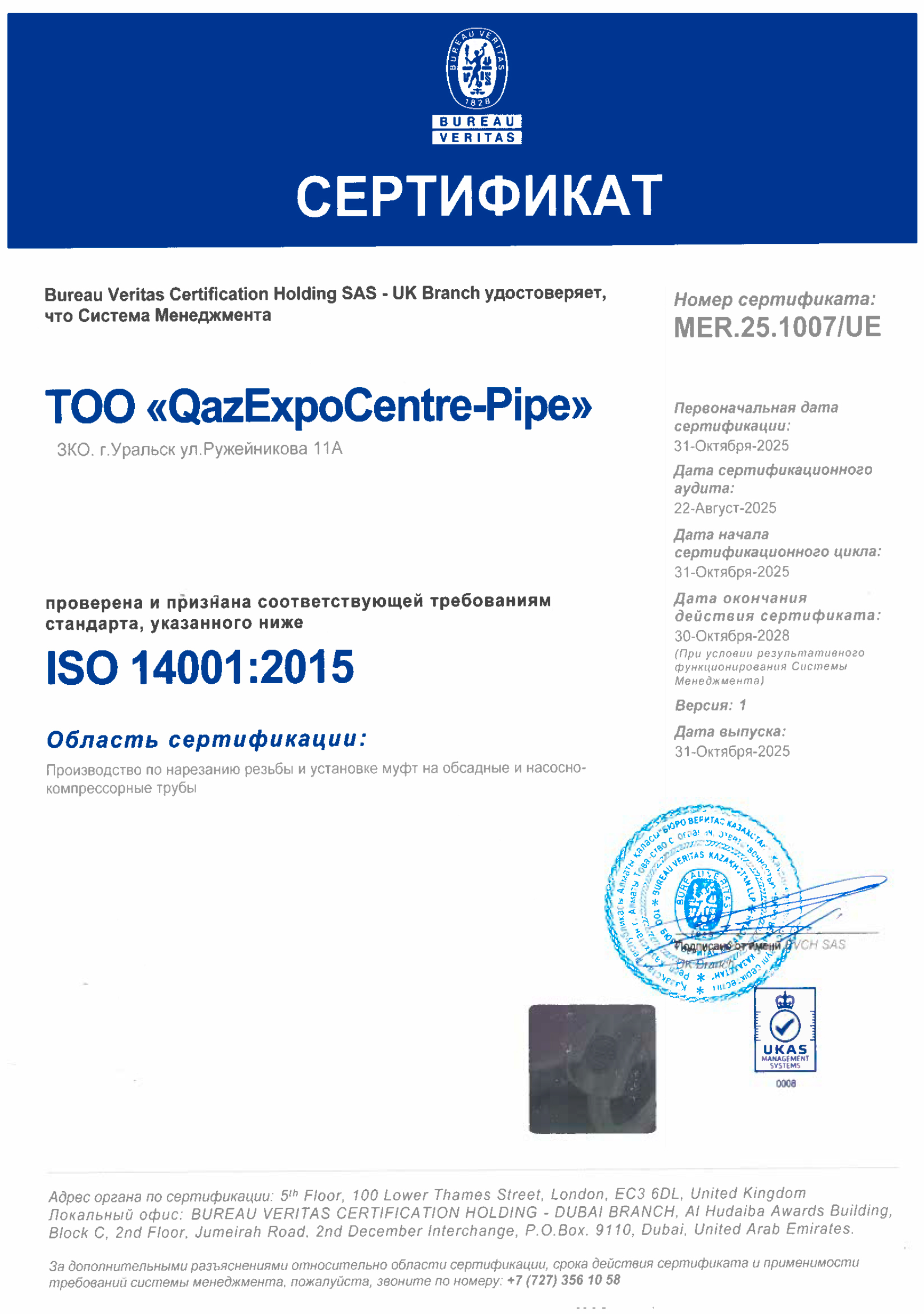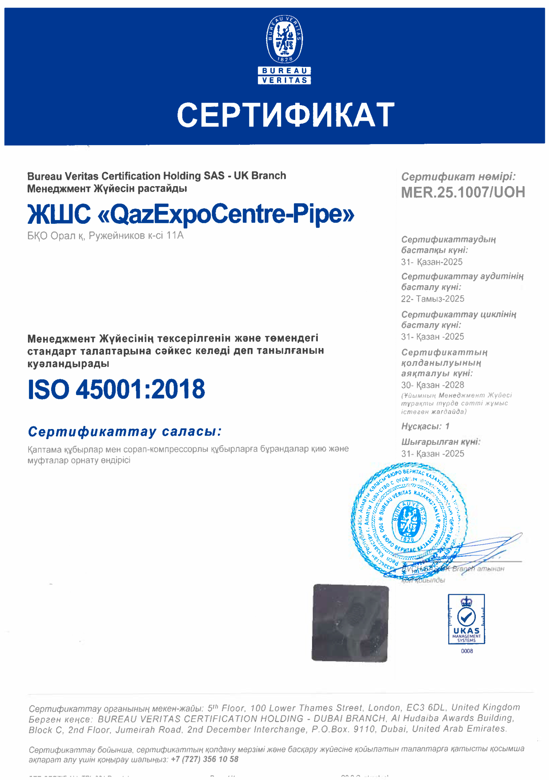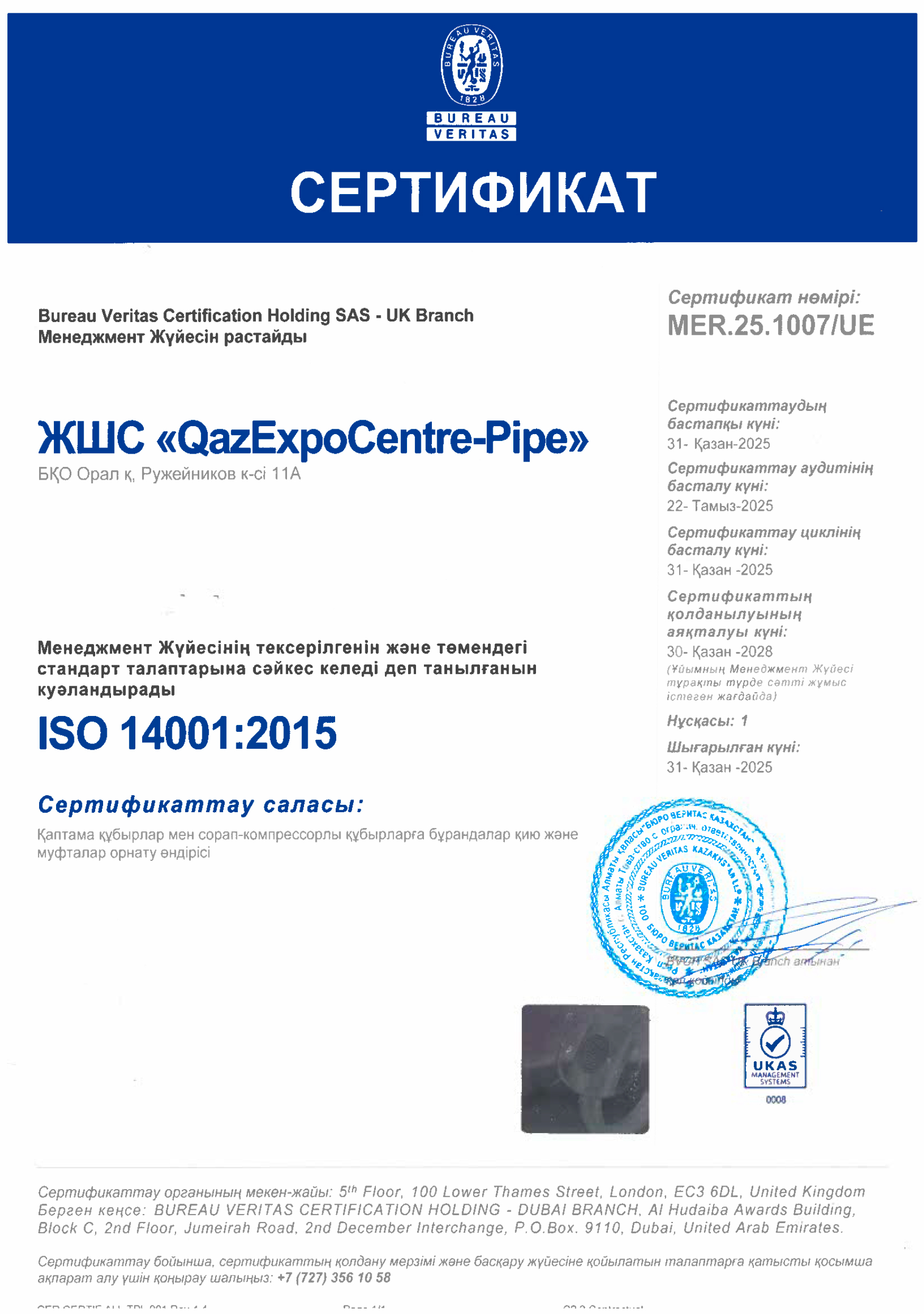 ТОО «QazExpoCentre-Pipe» состоит в Реестре отечественных производителей Казахстана, получив Индустриальный сертификат 1-й категории № 109 3 00020. Включено в Реестр товаропроизводителей Холдинга «Самрук-Қазына». «QazExpoCentre-Pipe» имеет действующие сертификаты о происхождении товара СТ KZ