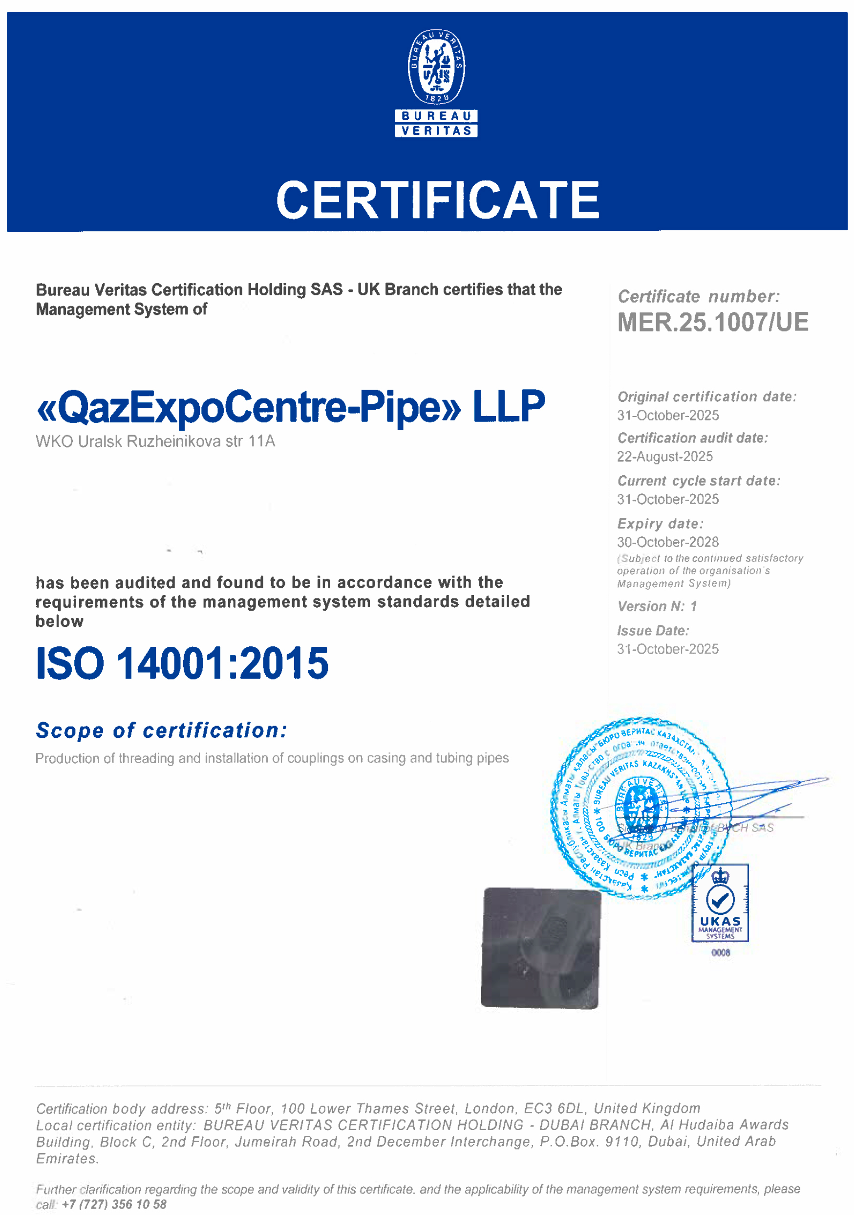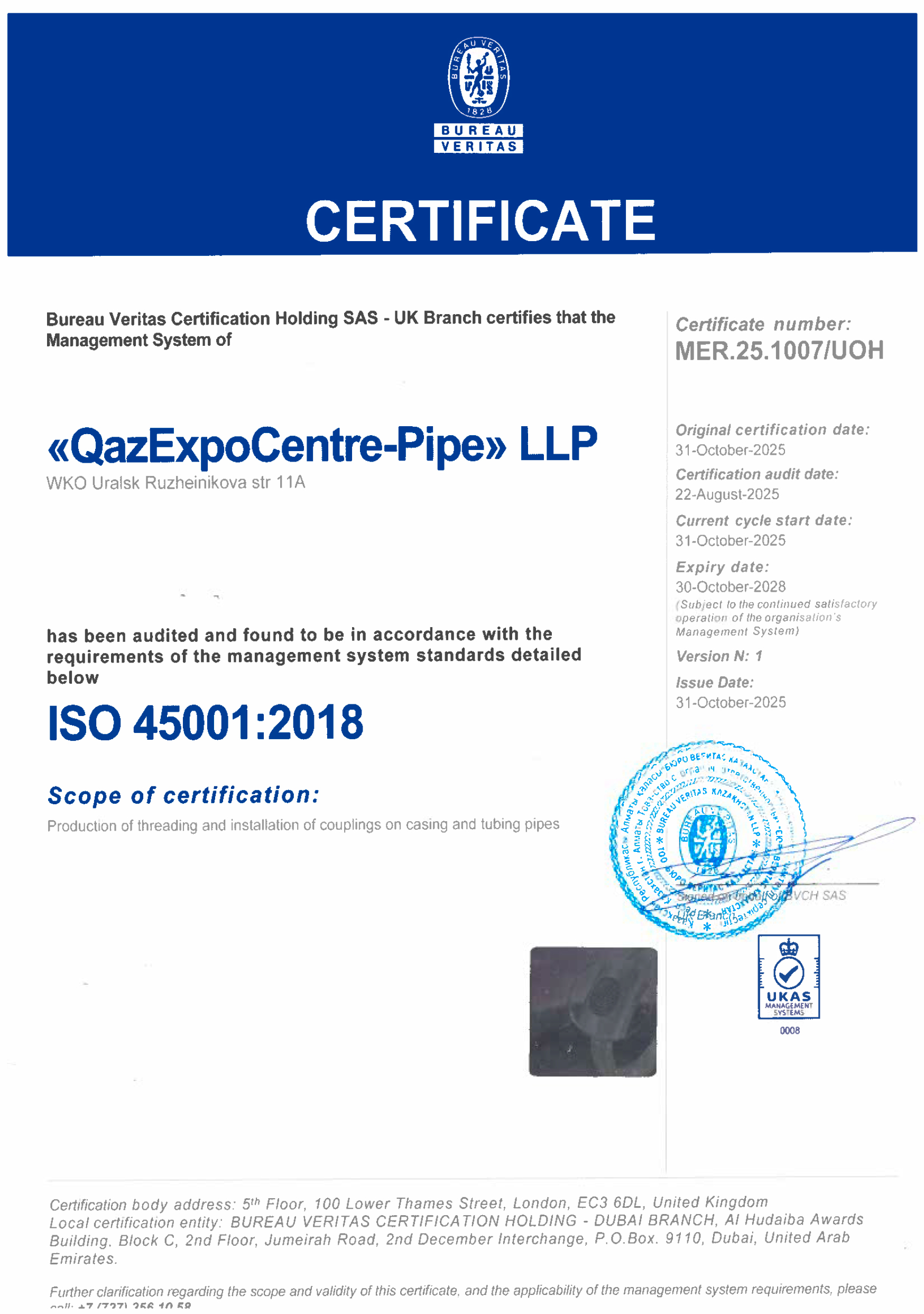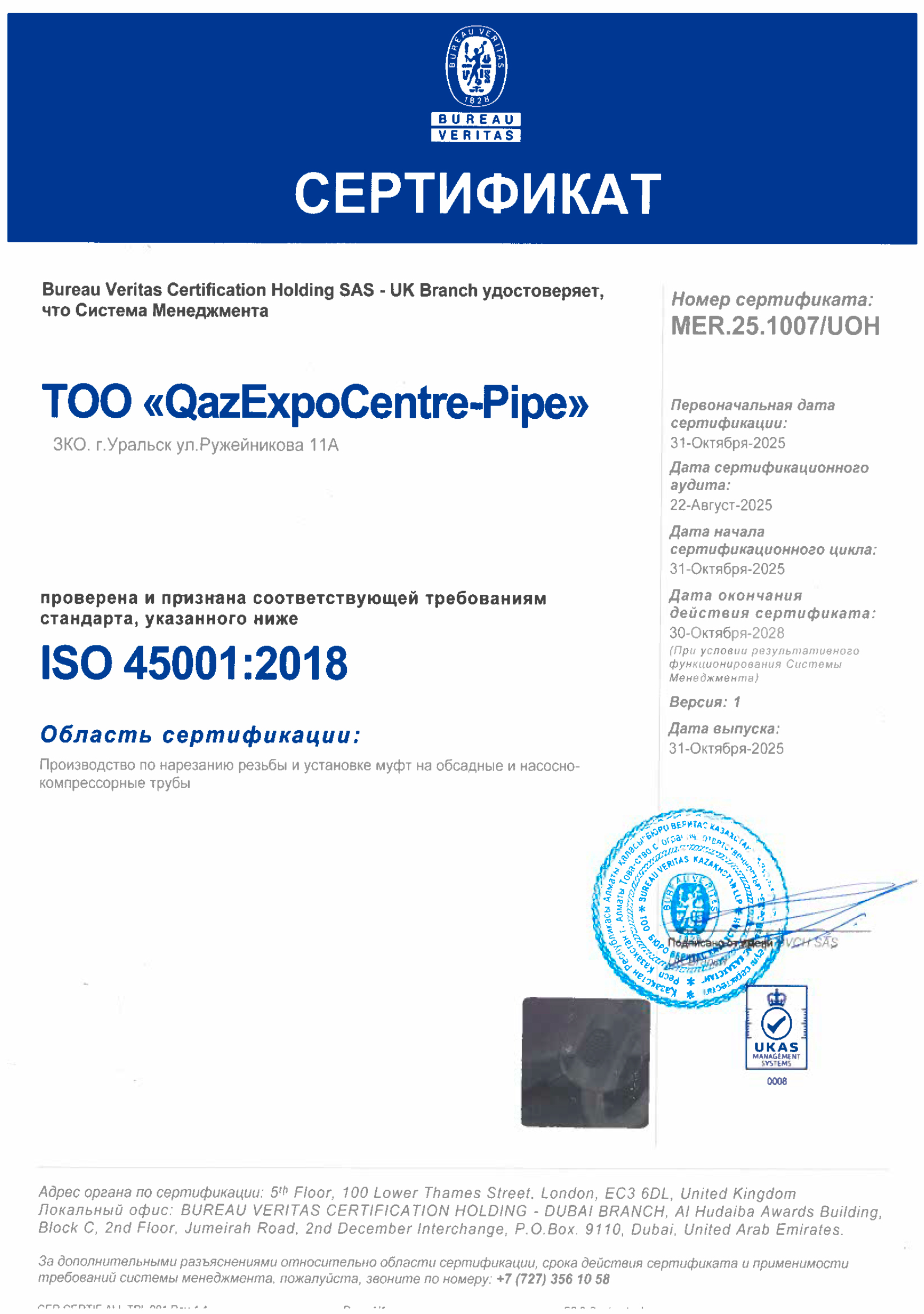 ТОО «QazExpoCentre-Pipe» состоит в Реестре отечественных производителей Казахстана, получив Индустриальный сертификат 1-й категории № 109 3 00020. Включено в Реестр товаропроизводителей Холдинга «Самрук-Қазына». «QazExpoCentre-Pipe» имеет действующие сертификаты о происхождении товара СТ KZ